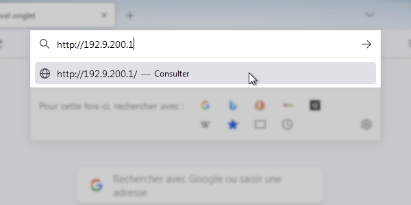 Si votre navigateur internet (Microsoft Edge, Mozilla Firefox, Google Chrome, ...) ne s'ouvre pas automatiquement à la connexion, l'ouvrir et taper http://192.9.200.1 dans la barre de recherche