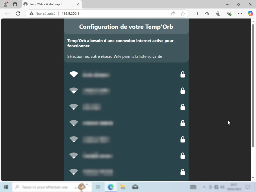 Une fois l'interface de configuration ouverte, suivre les instructions pour connecter Temp'Orb au réseau Wi-Fi de votre box.