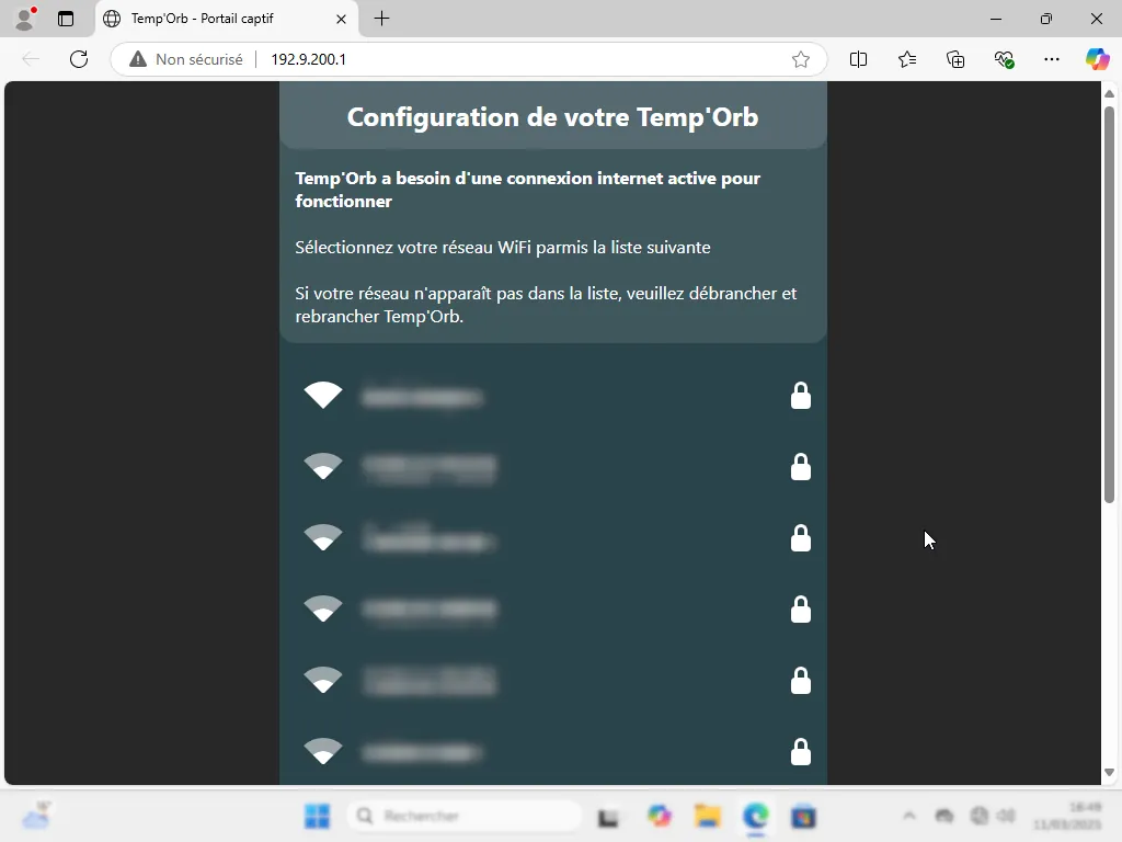 Il est parfois nécessaire de resélectionner le réseau TempOrb pour ouvrir l'interface de configuration de Temp'Orb